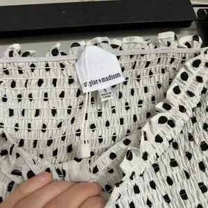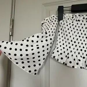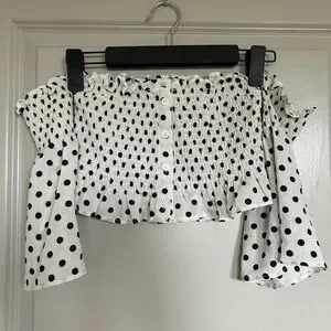 This stylish blouse features a playful polka dot pattern on a white base, complemented by flutter sleeves and a ruffled crop design. The light and airy fabric ensures comfort, making it perfect for both casual and dressy occasions.