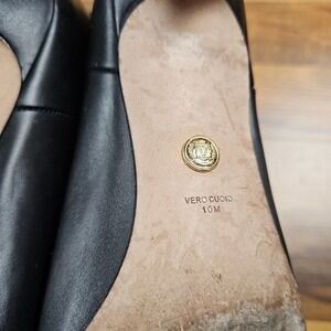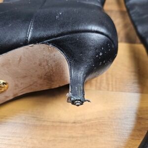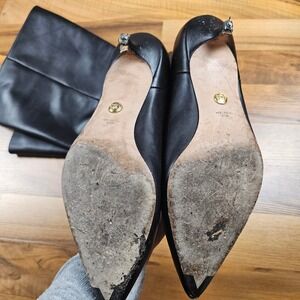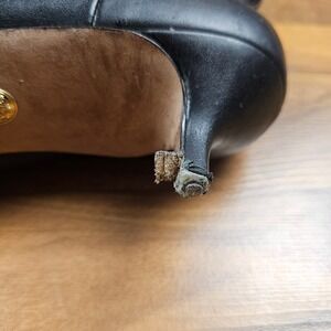Noticeable wear to the kitten heels including missing/damaged heel caps. Scuffing present on the pointed toes. Visible wear on the outsoles.