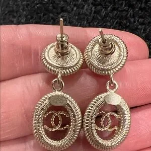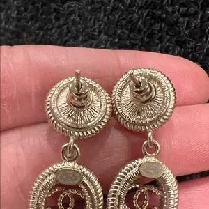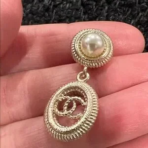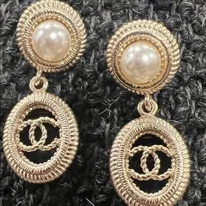 CHANEL drop earrings with faux pearl studs and textured gold-tone oval drops. Features interlocking CC logo in a twisted rope motif. Polished gold finish offers classic designer appeal. Easy to pair with dressy or casual looks.