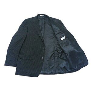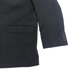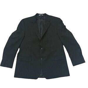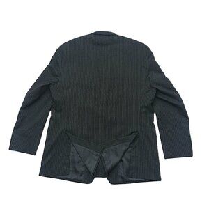 Design: The jacket features a classic two-button front, notched lapels, and a subtle pinstripe pattern on a charcoal base.