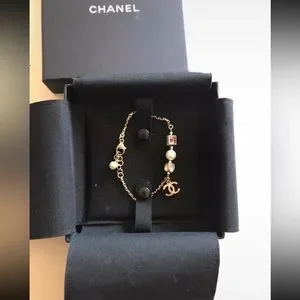 Chanel Gold-tone Chain Bracelet with Pink Crystal & Pearl Charm-NWOT-adjustable
