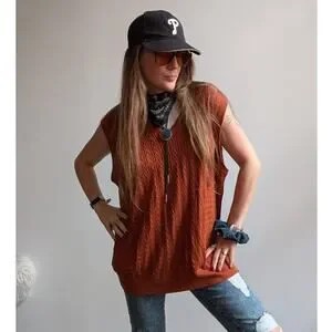 Closet staple! Soooo digging this comfy oversize slouchy vibe that layers with legit anything. Classic chunky cable knit sweater vest in super soft luxurious SILK. Drool. Dreamy rusty brick red orange brown fall hues. Major dark academia heritage gorpcore darling does cozy retro skater babe grunge girlie vibes. Super stretchy baby soft knit, V neckline, ribbed details. Lightweight feel, perfect for layers. Gently used, in excellent vintage condition.