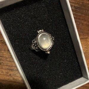 Elegant silver-toned poison ring featuring a polished oval white moonstone. Intricate vintage-inspired adjustable band detail adds timeless charm. Lightweight and comfortable for everyday wear. The white moonstone offers subtle iridescence to complement any outfit.