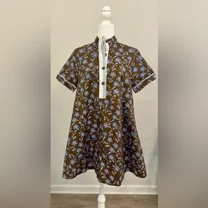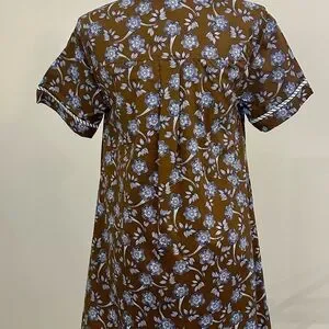 Charming dress features a delightful floral pattern. The brown base is beautifully complemented by blue flowers, creating a stylish look for any occasion. 4 functional buttons and 2 pockets. This is a generous fit so you can size down.