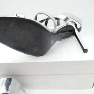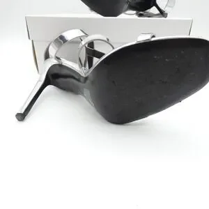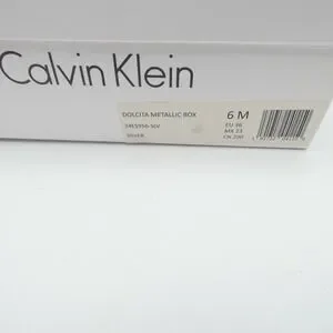 Calvin Klein Dolcita metallic silver sandals feature a striking cage-style strappy design with a high stiletto heel. These statement heels are crafted with a mirror-like metallic finish and include a wide ankle cuff with a secure hook-and-loop closure for a modern, architectural look. The square toe silhouette and branded footbed add a touch of contemporary sophistication, making them ideal for evening wear or special occasions. Includes original box. Note: Shows light wear on the outsoles and a small scuff on the inner strap of the right shoe.
