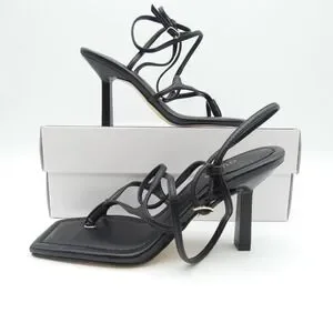 GUESS Leeba sandals in black feature a modern square toe and a strappy, wrap-around design for a sophisticated silhouette. These high-heel sandals are crafted with a thong-style toe post and delicate ankle ties that allow for a custom fit. The sleek stiletto heel and minimalist aesthetic make them a versatile choice for evening wear or special occasions. Brand new in box.