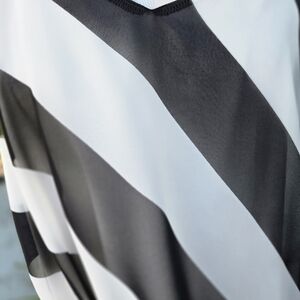 Chic black and white striped V-neck tank with adjustable spaghetti straps. Lightweight, flowy fabric for comfortable all-day wear. Versatile style that pairs easily with jeans or skirts. Features bold diagonal stripes in black and white.