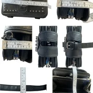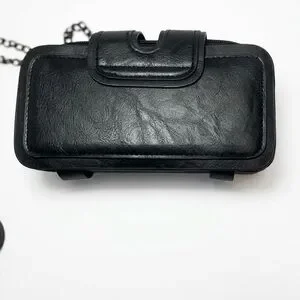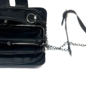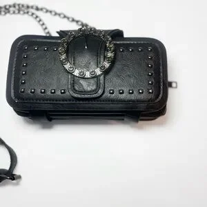 Edgy black studded crossbody wallet with rhinestone buckle.