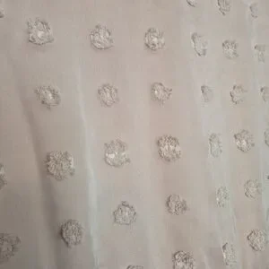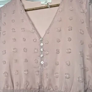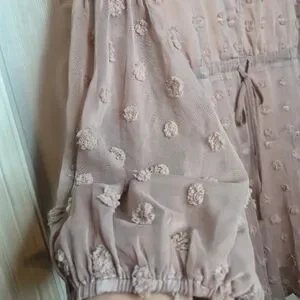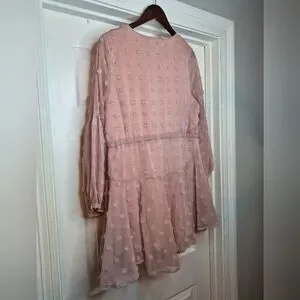 Soft dusty rose dress with raised dot texture. V-neck with small button placket. Sheer long sleeves and adjustable waist tie. Flowing skirt with gentle gathers.
