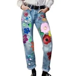 Misslook Floral Painted Blue Jeans Straight Leg High Waist Mom Jeans Artwear Art To Wear