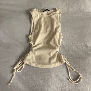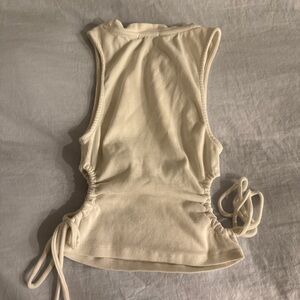 Soft cream sleeveless tank with open circle cutouts on the side drawstrings for a customized fit. Lightweight ribbed knit fabric offers comfortable stretch and everyday wearability. Clean neckline and modern ruched detail create a flattering silhouette. Smoke free home