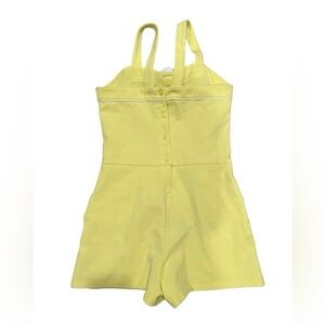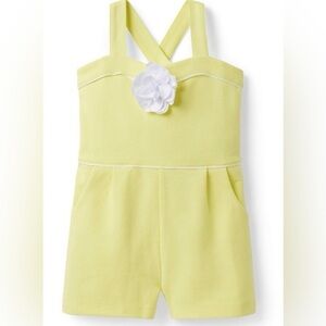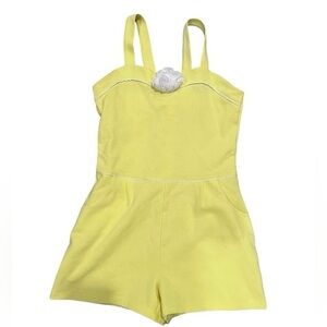 Pale yellow romper with crossed back straps. White fabric flower center front. Simple seam detailing and side pockets. Light, summery look.