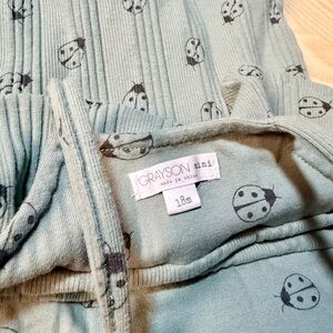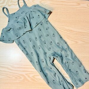 Soft sage green romper with sweet ruffle and ladybug print. Comfortable ribbed knit fabric for everyday wear. Easy pull-on style with thin straps. Sage green color adds a gentle, versatile look. Snap buttons in the crotch for easy diaper changes. Size 18 months.