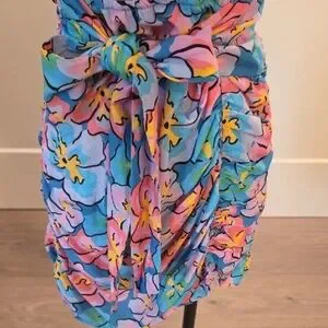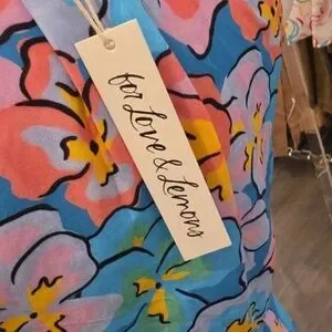 For Love & Lemons tropical floral dress in blue, pink and yellow pattern.