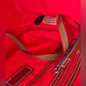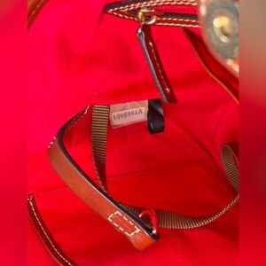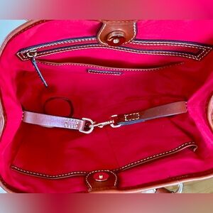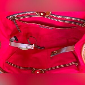 This Dooney has a leather strap to connect it from side to side, cinching in the sides. The roomy red cotton fabric lined interior has two large leather trimmed multi-function slip pockets and a leather trimmed zip pocket.