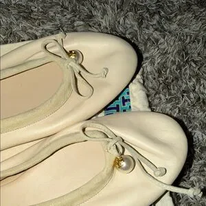 Tory Burch Cream Leather Ballet Flats with Bow & Pearl