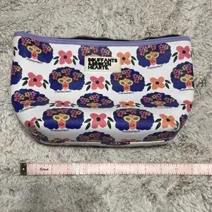 Bouffants & Broken Hearts cosmetic bag in white featuring a vibrant purple floral-afro print and pink and orange flower accents. Durable zip closure and wipe-clean exterior. Stylish, travel-ready carry for makeup and essentials. Bright purple and white colors add playful flair.