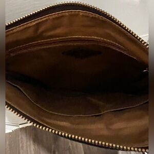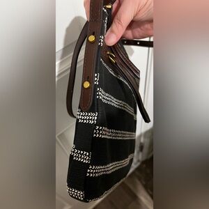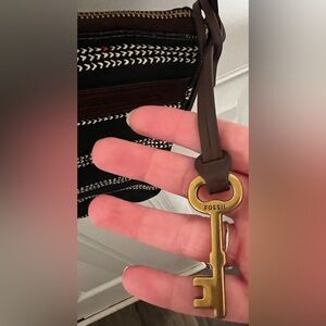 FOSSIL Fiona Crossbody Bag Black White Geometric Pattern Brown Leather Strap - this is a lovely, pre-owned purse in excellent condition ! No issues or flaws that I can see. Interior & exterior are very clean. See pics for measurements & various angles. Comes with the Fossil signature key charm.