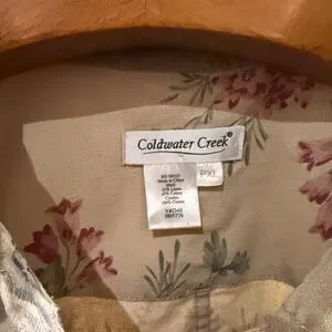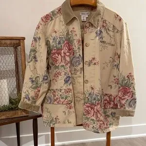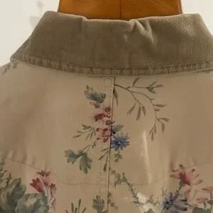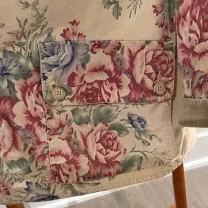 Vintage 1990s Classic Coldwater Creek utility jacket. Cream background with pink and blue floral print. Button front and patch pockets. Soft, casual styling. Easy to layer over tees or sweaters.