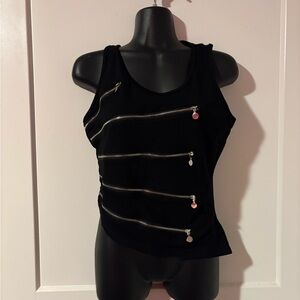 Edgy sleeveless tank with five decorative horizontal zippers. Fitted silhouette with scoop neckline. Metallic zipper pulls add shine. Easy to style for day or night.