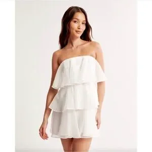Strapless tiered mini dress with soft ruffle layers. Lightweight, flowy fabric with a flattering A-line silhouette. Clean, versatile white design for events or warm-weather outings.
