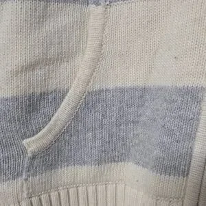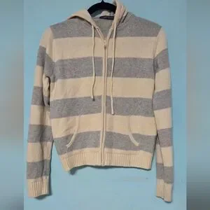 Soft knit Brandy Melville hoodie with front zipper. Cream and light gray horizontal stripes. Hood with drawstrings. Casual, cozy layering piece.