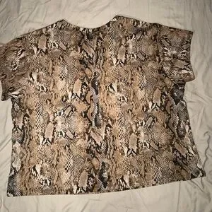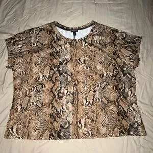 Torrid short sleeve blouse with allover snake print. Lightweight knit with crew neckline. Relaxed, boxy fit. Bold neutral pattern for easy styling.