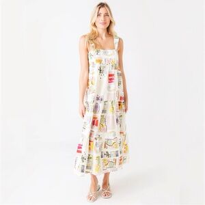 Designed with a flattering square neckline and wide straps, the silhouette flows into a relaxed, tiered maxi skirt that moves gracefully with every step. The standout feature is its abstract, painterly print in soft neutrals with pops of color—giving it a contemporary, art-inspired vibe that feels both unique and timeless