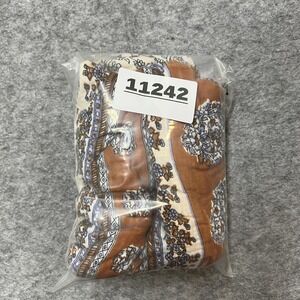 Color and pattern: Multicolor mix of cream, caramel brown, and soft blue with floral and paisley border motifs and tonal stitching.