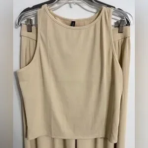 Soft beige wide-leg pant and tank with an elastic waist and pockets . Lightweight, flowy fabric for all-day comfort. Versatile neutral color that fits any occasion. Designed for a relaxed, stylish silhouette.