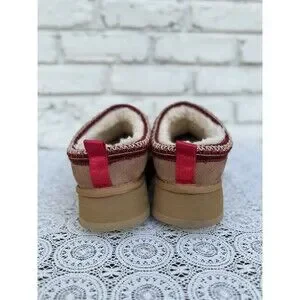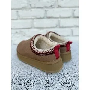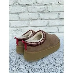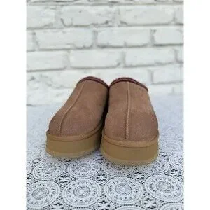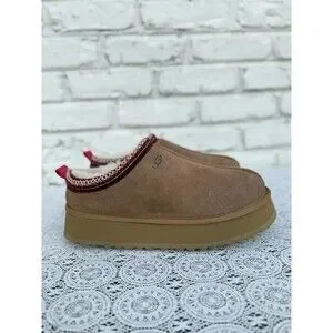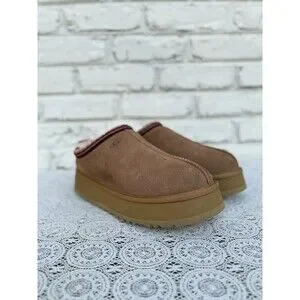 The UGG Tazz II Women's Size 9 Platform Shoes in Chestnut Color are brand new with box, featuring a round toe shape, slip-on closure, and low heel height for ultimate comfort. These casual slipper-style platform shoes are lined with shearling fabric and wool insole, making them ideal for winter, summer, fall, and spring seasons. The brown suede upper, rubber outsole, and signature UGG logo accents add stylish touch to this classic Ugg product. Perfect for women looking for a cozy yet trendy footwear option.