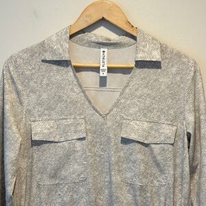 Attributes: Long sleeve, V-neck with collar, Drawstring waist, Chest flap pockets, Ribbed cuffs, Shirttail hem, Lightweight stretch fabric, Snake skin pattern