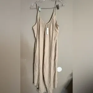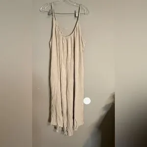 Effortless beige jumpsuit with thin spaghetti straps for a breezy look. Lightweight, breathable fabric offers all-day comfort. Wide-leg silhouette creates a relaxed, flattering fit. Easy to dress up or down for casual outings or vacation days.