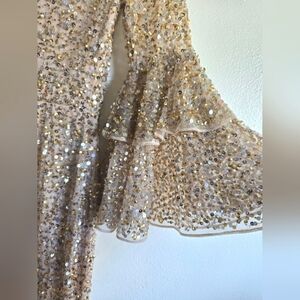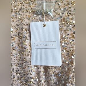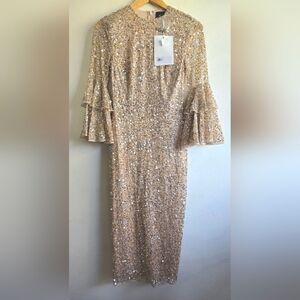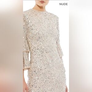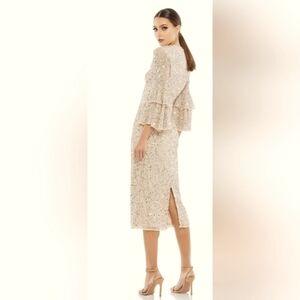 NWT! Mac Duggal, Fully Sequined Ruffle Tiered 3/4 Sleeve Midi Dress,Nude, SIZE 2
