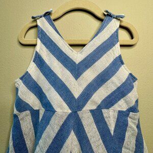 Beautiful Pink Chicken girls dress featuring a classic blue and white chevron stripe pattern. Designed with a sleeveless fit-and-flare silhouette and a full skirt, finished with a peekaboo blue tulle petticoat for extra volume and twirl.