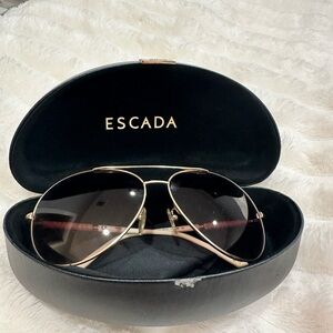 Escada aviator-style sunglasses with gold-tone metal frames. Pink gradient lenses provide a soft, fashionable tint. Slim double bridge and adjustable nose pads. Timeless, chic accessory for stylish looks.