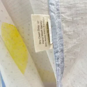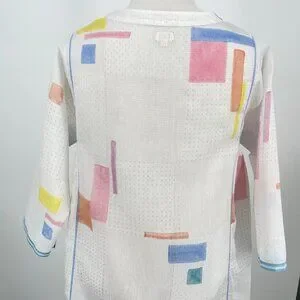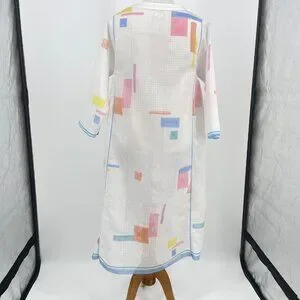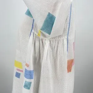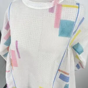 + Notable Details: Sheer white base with a woven dot texture. Pastel pink, blue, yellow, and orange abstract/geometric block print. Long sleeves. Round neckline. Dramatic tent/smock silhouette with gathered side panels for added volume and drape.