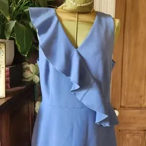 Polished Ann Taylor sleeveless sheath dress in a soft blue hue with an elegant ruffle detail at the V-neckline. Tailored silhouette with a defined waist creates a flattering, professional look that transitions easily from office to events.