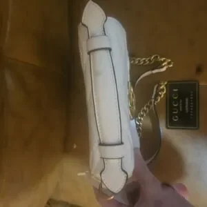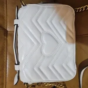Top handle shoulder bag Matelassé design with heart on the back Double G Removable chain strap with leather detail Interior slip pocket 2.5" handle drop 21.5" strap drop 8" x 6"H x 3" it does have a pink mark on the side you can see it in the picture and a little wear on the flap also can see in the picture so will be decently discounted for the discrepancies.