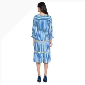 Keywords: midi dress, striped dress, bohemian, resortwear, vacation dress, tiered dress, embellished neckline, lightweight, feminine, casual chic, day dress, summer dress