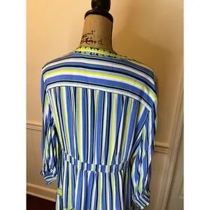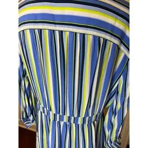 JOHN MARK Striped V Neck Tiered Midi Dress Blue Yellow Embellished Size L