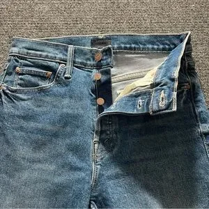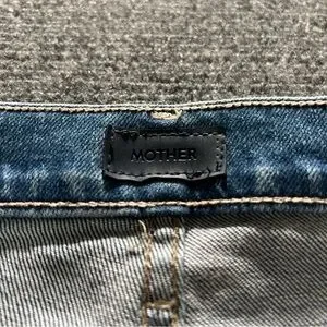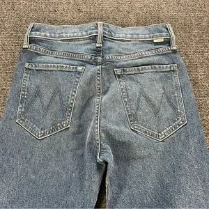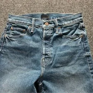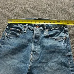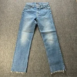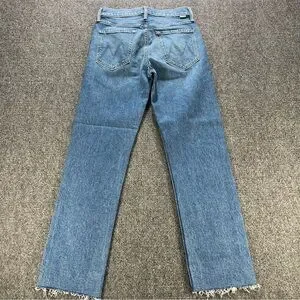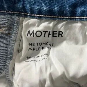 The product is a pair of Mother The Tomcat ankle fray blue jeans in size 27. These jeans feature fray ends, a button closure, and a straight style. They are made in the United States and have a solid blue color with medium fabric wash. Perfect for women looking for a stylish and comfortable pair of jeans to add to their wardrobe.