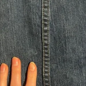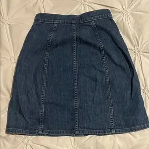 Gorgeous A-line silhouette in dark blue denim. Front center button closure with brown buttons. Vertical seaming for subtle shape. Classic versatile skirt for casual looks. Has a lighter spot but not noticeable and I believe it came like that!
