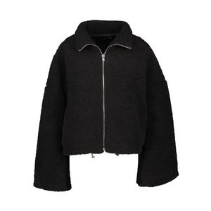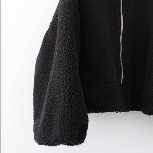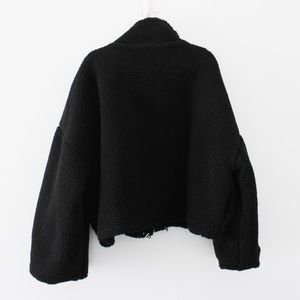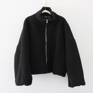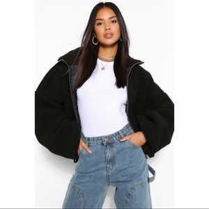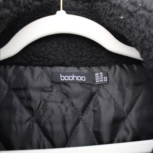 Boohoo black, solid, long sleeve, zip up, crop teddy faux fur bomber jacket. Shearling teddy fabric construction. Zip front closure. Wide sleeves with elasticized cuffs. Stand collar. Oversized, cropped silhouette. Adjustable drawcord waistband. Excellent condition.