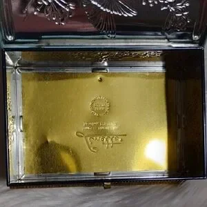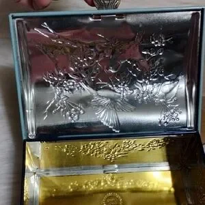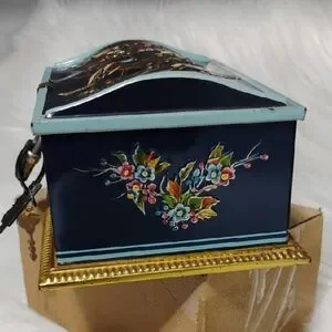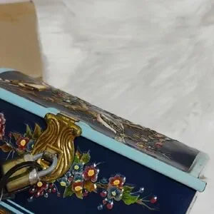 Vintage Made In Germany, James P. Linette Hand-painted blue jewelry box with floral and bird motif. Features gold-tone accents and a working lock for secure storage. Elegant decorative piece that complements bedroom or vanity decor. See pictures for signs of age like some rust, some denting, rubbing. Will include the lock and keys.