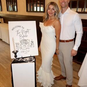 Elegant white midi dress with delicate ruffle trim and thin spaghetti straps. Soft, figure-flattering silhouette designed for evening events. Lightweight fabric with feminine flounce at hem for graceful movement.