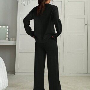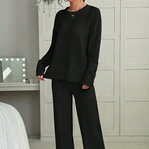 Black Casual Women's Round Neck Long Sleeve Sweater Top And Long Pants Set