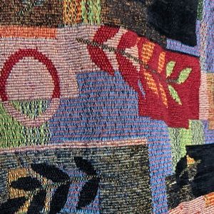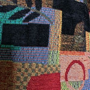 What a beautiful jacket! Reminds me of tapestry. Beautiful color palette and image details. Full zipper front closure. Fabulous condition!