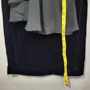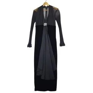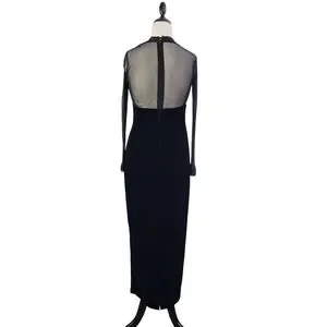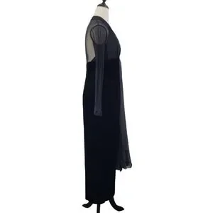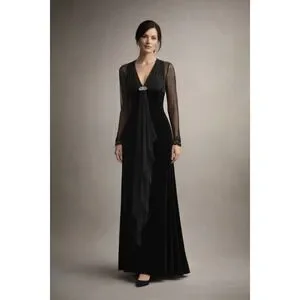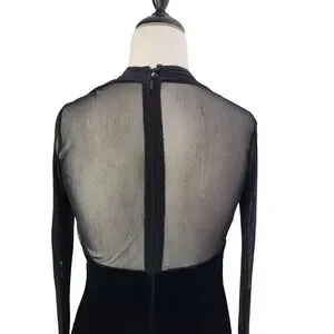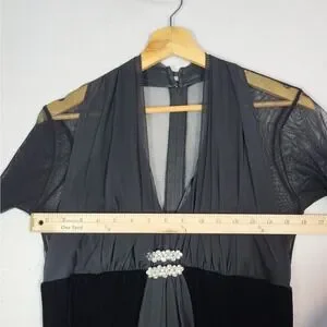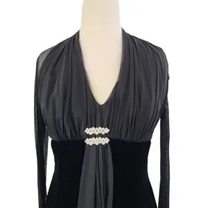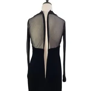 Vintage early 1990s Jessica McClintock black velvet evening gown featuring sheer illusion sleeves and back, soft romantic ruching, and a cascading sheer front drape accented with rhinestone detail. The elegant drape creates beautiful movement and offers gentle, flattering coverage through the midsection while maintaining a refined, elongated silhouette.