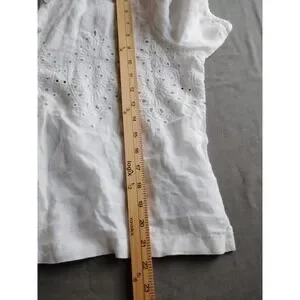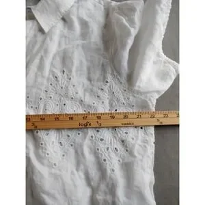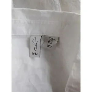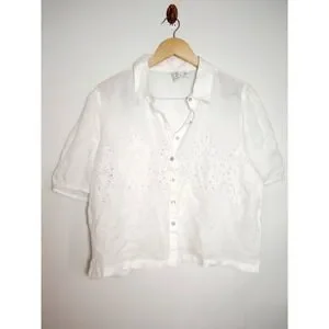 Resort Fairy Coquette Angel Boho Sexy Feminine ---The Joie Women XL 100% Linen White Eyelet Short Sleeve Button Crop Shirt is a versatile and stylish top perfect for various occasions including casual, formal, workwear, and even travel. The lightweight and breathable fabric of linen makes it comfortable to wear in all seasons. The white color with eyelet pattern and short sleeves add a touch of elegance, while the cropped style and relaxed fit give it a trendy and relaxed look. This shirt from the brand JOIE is sure to become a favorite in your wardrobe, offering both style and comfort.